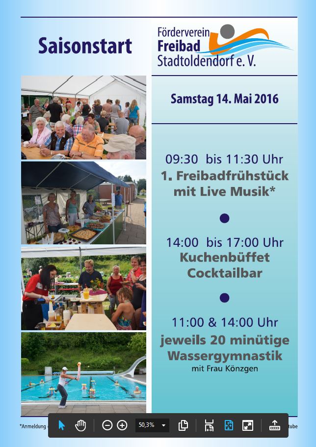 Am 14. Mai wird die neue Saison mit einem Frühstück im Bad eröffnet. Der Eintritt ist traditionsgemäß an diesem Tag frei! Für eine Teilnahme am Frühstück (Kosten 7,00 €) ist eine Voranmeldung erforderlich. Vorverkauf bei:
