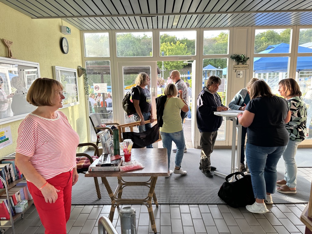 Endlich konnten wir den Start in die neue Badesaison mit einem zünftigen Frühstück im „Haus am Eberbach“ feiern. Zahlreiche Vereinsmitglieder und Freunde des Fördervereins waren der Einladung des Vorstandes gefolgt und so wurde es ein fröhliches Wiedersehen nach langer Winter- und Corona-Pause. Die erste Vorsitzende des Vereins nutzte die Gelegenheit, sich noch einmal bei dem bisherigen Schriftführer des Vereins, Robert Kreikenbohm, mit einem kleinen Präsent für die langjährige Mitarbeit zu bedanken. Robert wechselt in den Beirat des Vereins und wird somit diesem weiterhin mit seiner technischen Expertise zur Verfügung stehen.