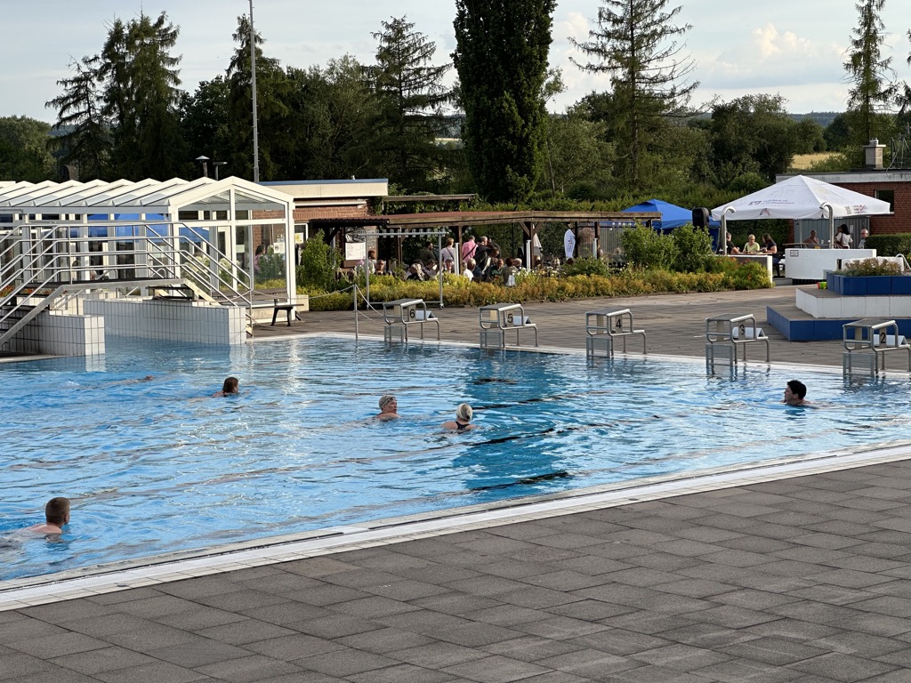Der Förderverein hatte auch in diesem Jahr gemeinsam mit dem Kioskbetreiber alle Mitglieder, Freunde und Förderer zu einem Eröffnungsfrühstück eingeladen und damit rd. 50 Personen ins Freibad gelockt. Zwar hatte der Regen der Nacht zuvor einwenig Sonnenschein Platz gemacht, aber dennoch war es eher „Maikühl“ bei Temperaturen von knapp 12° C. Das tat der Stimmung jedoch keinen Abbruch und der Kioskbetreiber Sunny hatte wieder ein umfangreiches Buffett zusammengestellt. Und trotz der eher kühlen Temperaturen haben es sich doch einige Unentwegte nicht nehmen lassen, ein paar Bahnen zu schwimmen! Hier eine kleine Foto-Nachbetrachtung..Die Saison 2025 läuft…