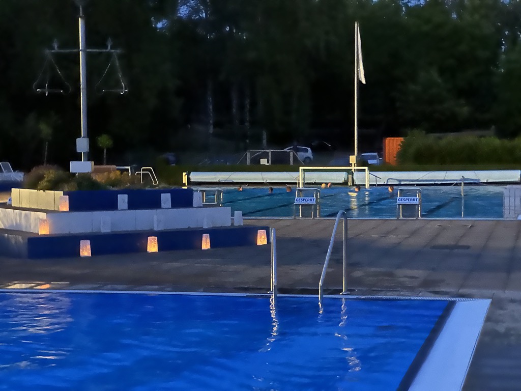 Ein besonderes Highlight im Freibad Stadtoldendorf war das vom Förderverein organisierte „1. Vollmondschwimmen“ am 01. August. Vorhergesagt war ein sogenannter Supervollmond – der im Laufe des Abends tatsächlich noch zwischen den Wolken hervorkam! Auch wenn es anfänglich nicht so aussah, der Wettergott hatte ein Einsehen und zur richtigen Zeit den Regen abgestellt! Über 100 Schwimmfreunde waren der Einladung des Vereins gefolgt und fast alle waren bis zum Schluss dabei! Der Förderverein hatte eine „Sektbar“ – in der es natürlich nicht nur Sekt gab – organisiert und auch der Freibad Kiosk war geöffnet!