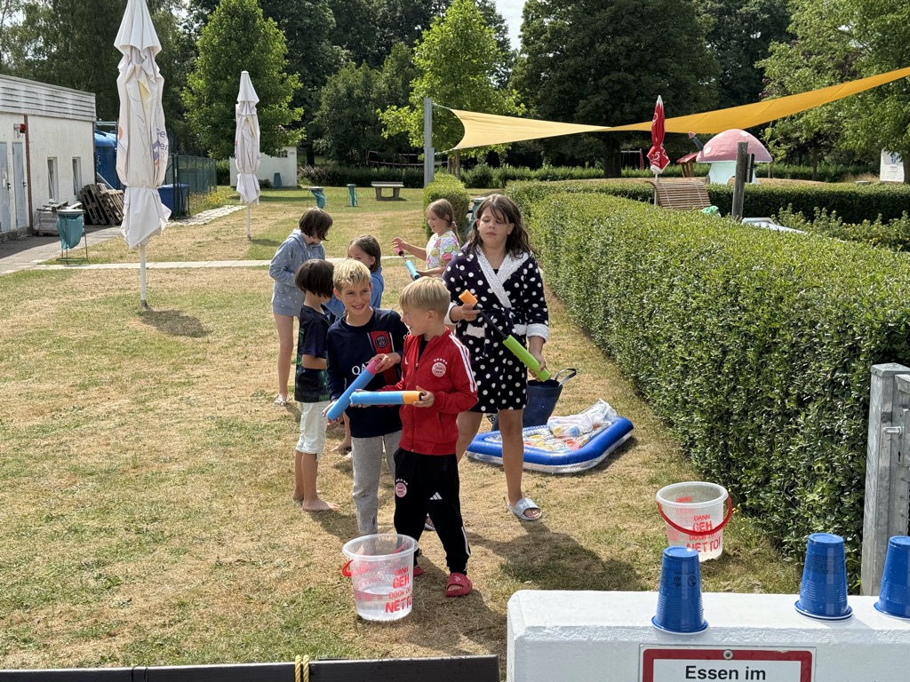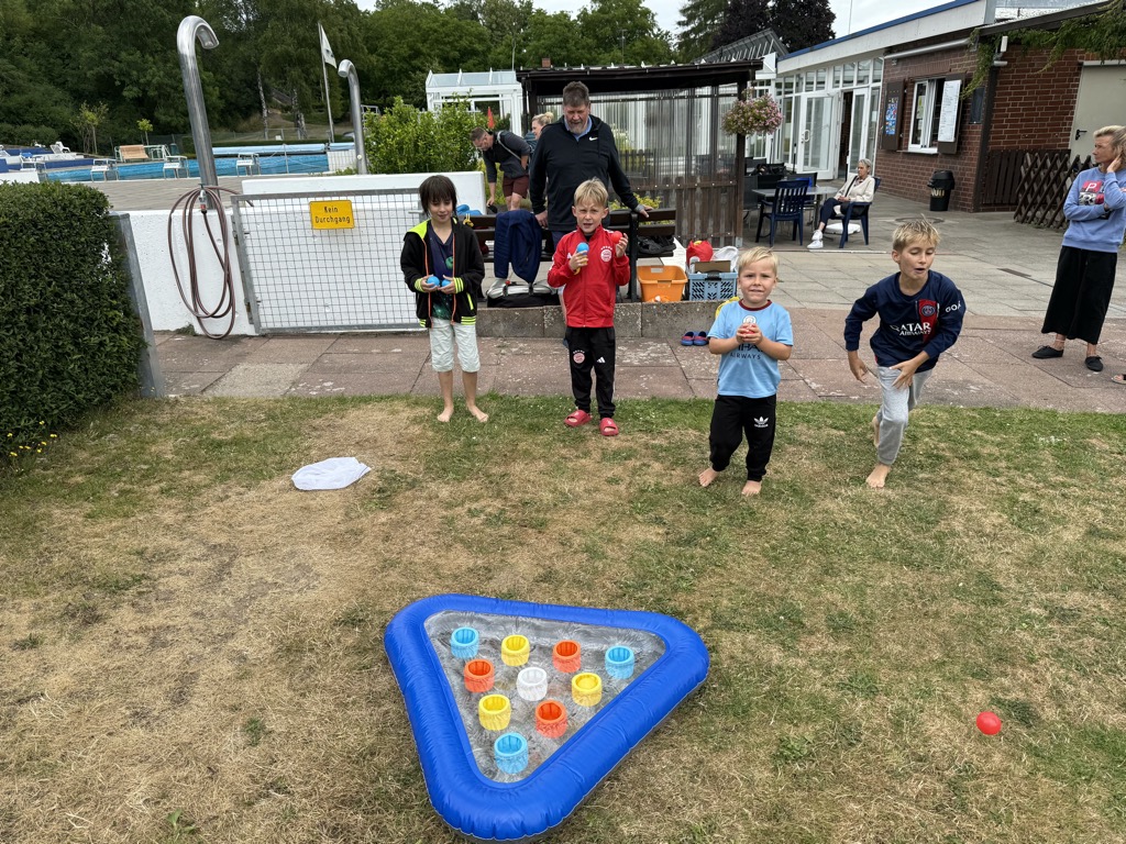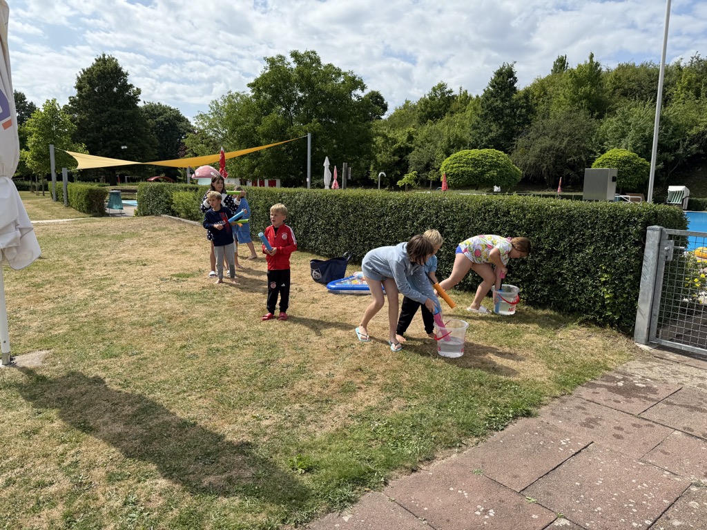 Nach dem Warmmachen auf der Wasserrutsche hatten die Kinder viel Spaß und Energie beim beliebten Tauziehen und den Staffeln mit allerlei Gegenständen quer durch das Nichtschwimmerbecken und draußen am Beckenrand war das Wasserbombenwerfen wieder ein großer Lacherfolg.