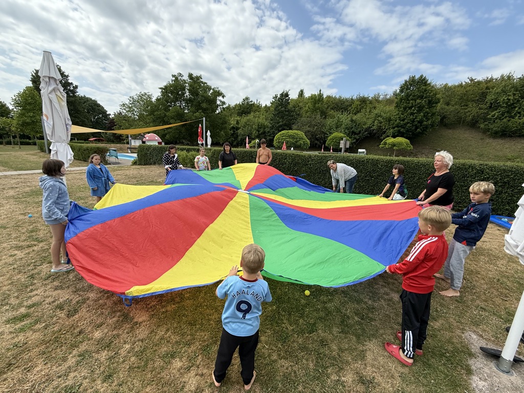 Neben Tauchen und Wettschwimmen nach Bällen und Ringen hatten die Kinder viel Freude an dem Basketballspiel im Wasser. Eine Staffel mit Tablett und Wasserbecher wurde durchgeführt und die Geschicklichkeit getestet. Auf der Wiese war das Wasserbombenwerfen wieder ein großer Lacherfolg und die Spiele mit dem Schwungtuch machten den kleinen und großen Kindern viel Freude.