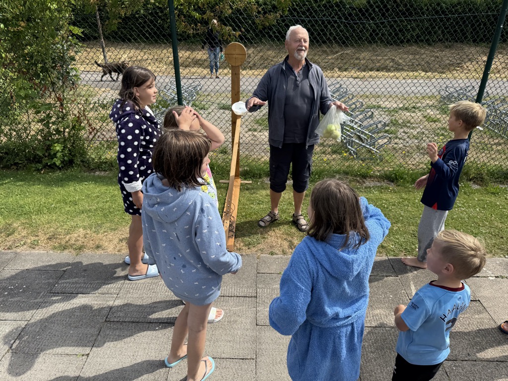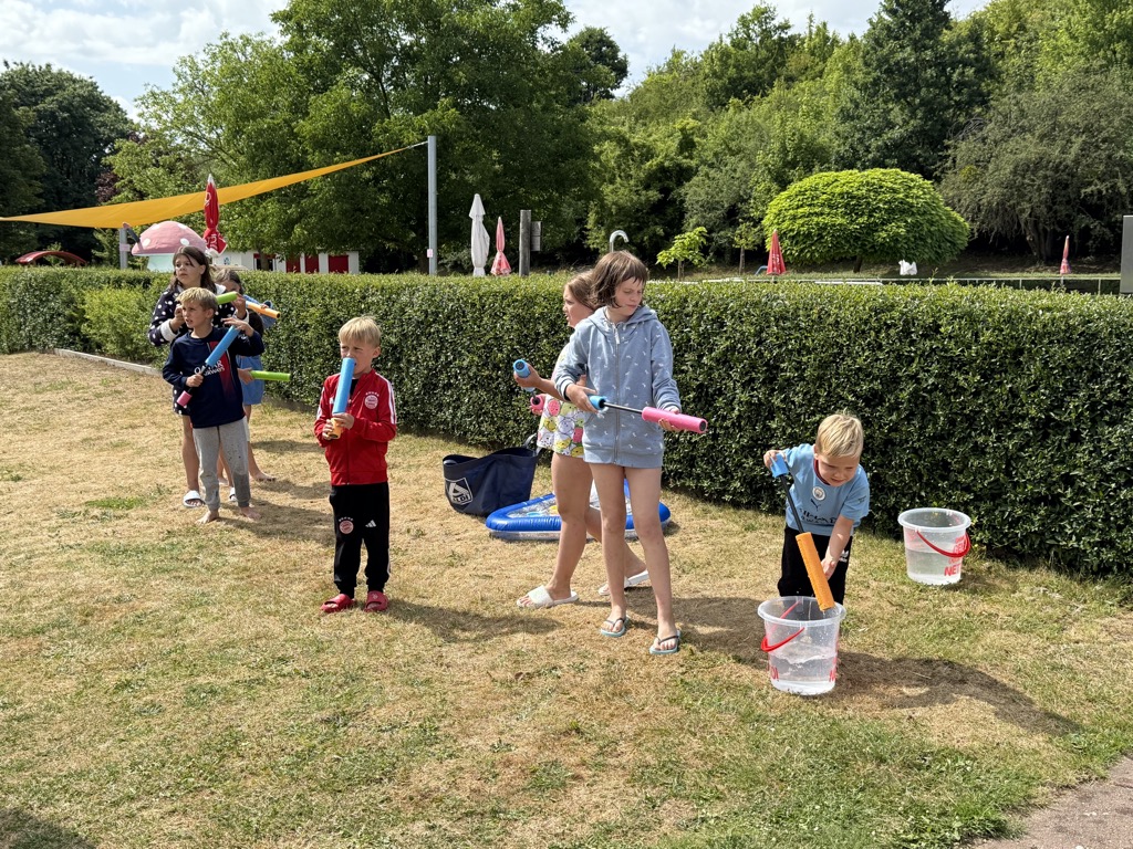 Ob beim Wettschwimmen mit Luftmatratzen oder Tauziehen im Wasser, alle Kinder waren mit großer Freude und Energie dabei. Die bewährte selbstgebaute „Süßigkeiten-Schleuder“ von Robert Kreikenbohm war auch der Wiese wieder der Renner bei den Kindern und auch beim Wasserbomben-Werfen war der Spaß groß.