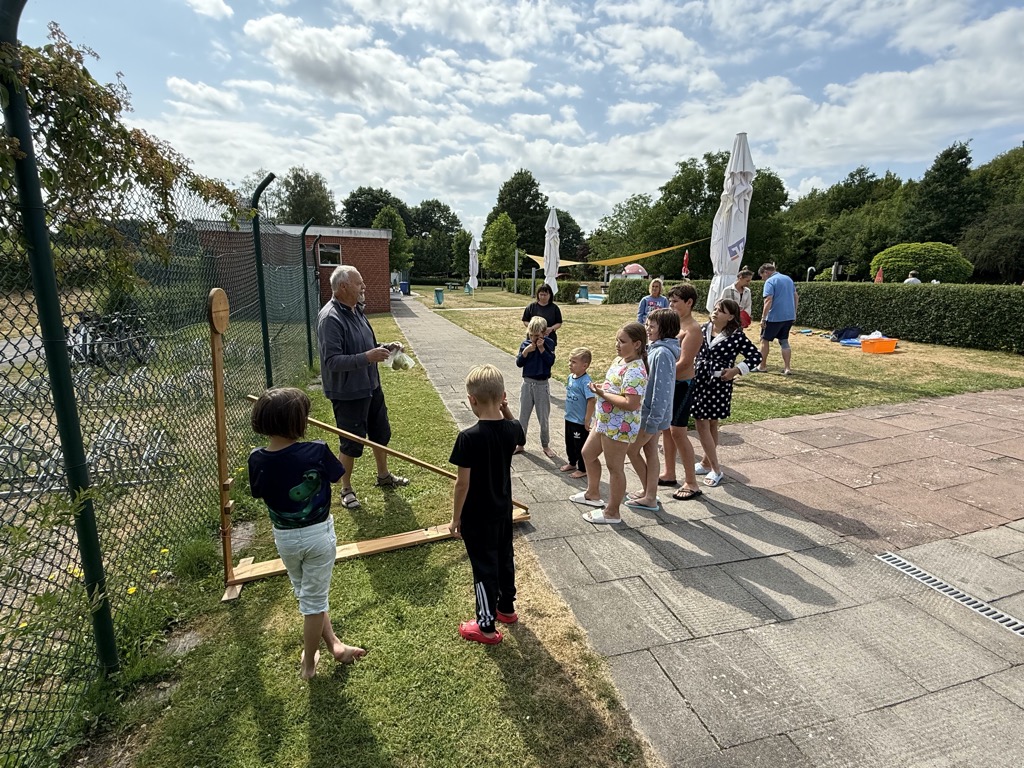 mit Seifenblasen die Kinder beschäftigt und Robert Kreikenbohm, wie auch im vergangenen Jahr, mit seiner selbstgebauten Wurfschleuder. Natürlich gab es auch in diesem Jahr allerlei kleine Gewinne, was den „Spaßfaktor“ sichtlich erhöhte.Kaffee im Freibad…